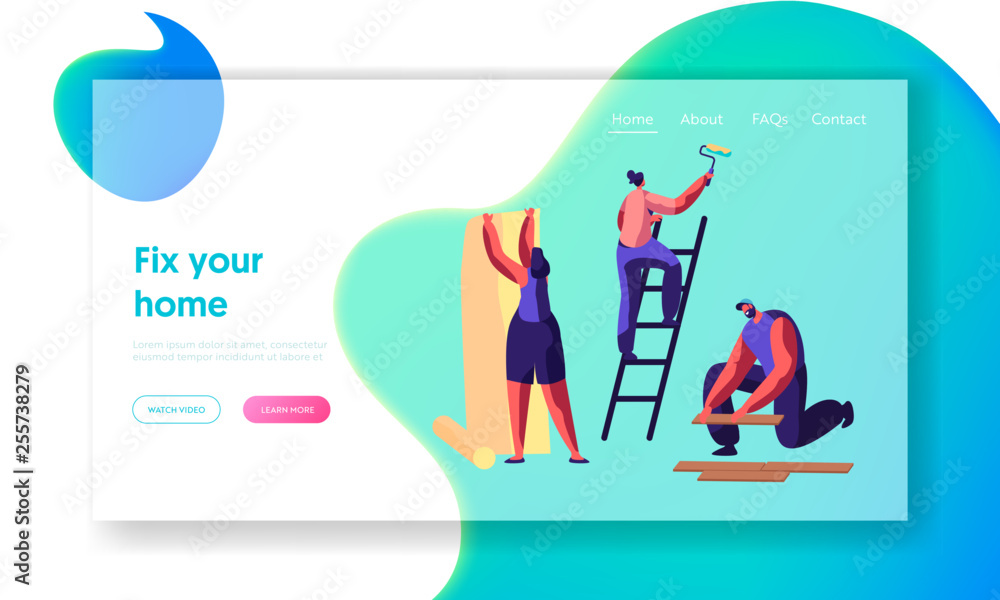 Repair Service Professional Worker Landing Page Woman Glues Wallpaper Human Hold Paint Roller Man Lay Laminate Renovation Team Work In Room Website Or Web Page Flat Cartoon Vector Illustration Stock Vector